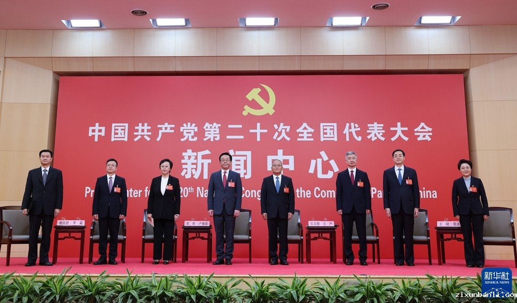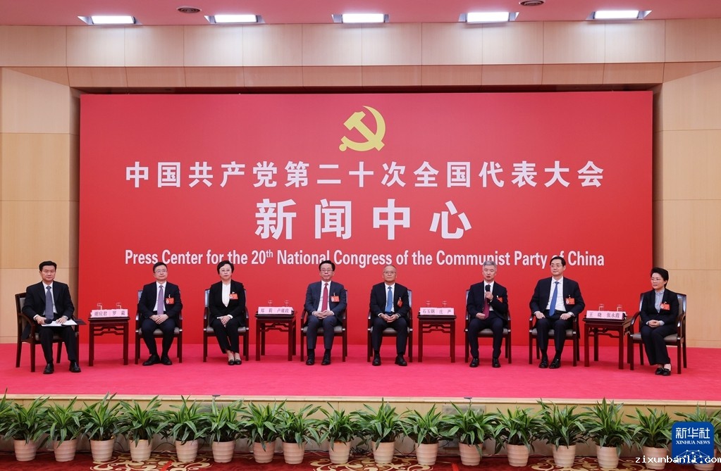 10月19日,中国共产党第二十次全国代表大会新闻中心举行集体采访。重庆、四川、贵州、云南、西藏、陕西、甘肃代表团新闻发言人出席,介绍代表团学习讨论二十大报告情况,并回答记者提问。新华社记者 陈建力 摄