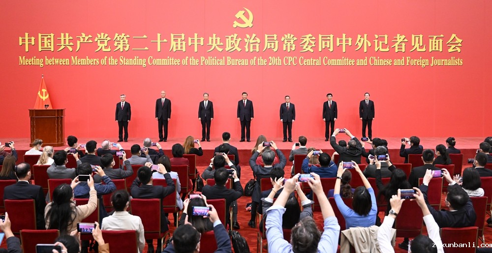 2022年10月23日12时许,人民大会堂金色大厅华灯璀璨,气氛热烈。中国共产党第二十届中央委员会总书记习近平和中央政治局常委李强、赵乐际、王沪宁、蔡奇、丁薛祥、李希步入大厅,同采访党的二十大的中外记者亲切见面。