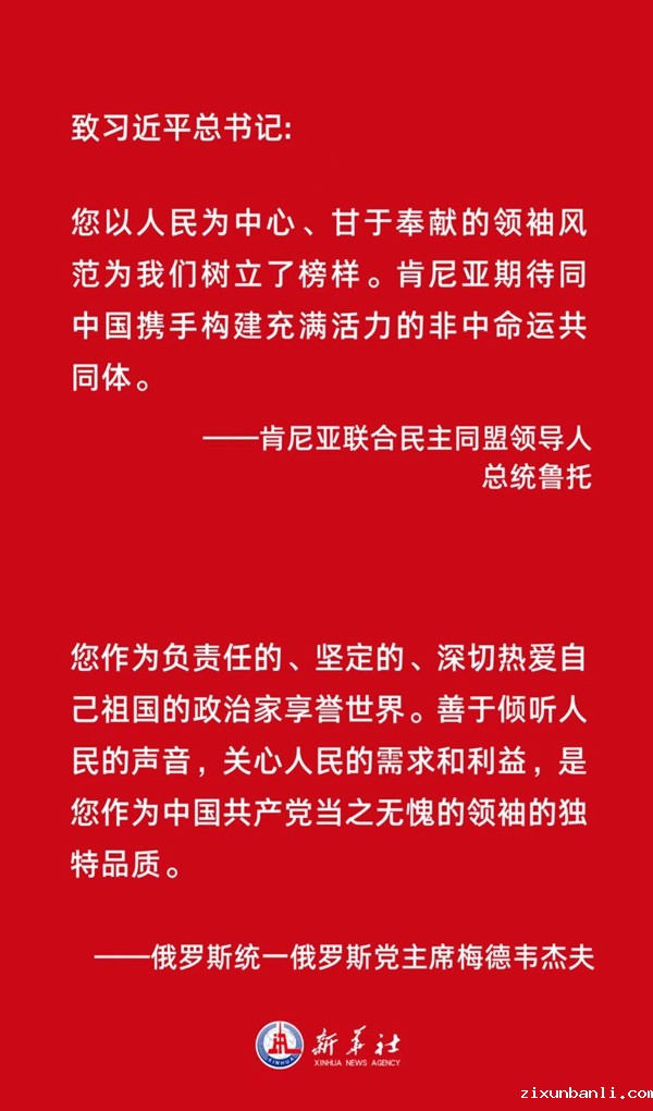 俄罗斯统一俄罗斯党主席梅德韦杰夫表示,您作为负责任的、坚定的、深切热爱自己祖国的政治家享誉世界。善于倾听人民的声音,关心人民的需求和利益,是您作为中国共产党当之无愧的领袖的独特品质。