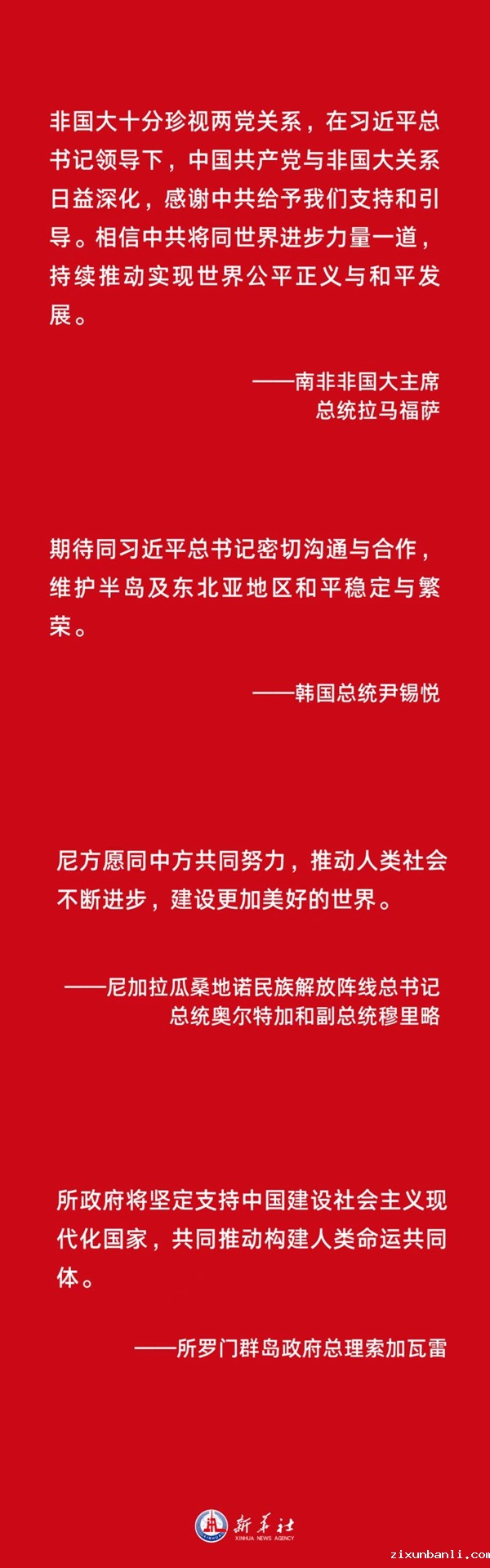 南非非国大主席、总统拉马福萨表示,非国大十分珍视两党关系,在习近平总书记领导下,中国共产党与非国大关系日益深化,感谢中共给予我们支持和引导。相信中共将同世界进步力量一道,持续推动实现世界公平正义与和平发展。