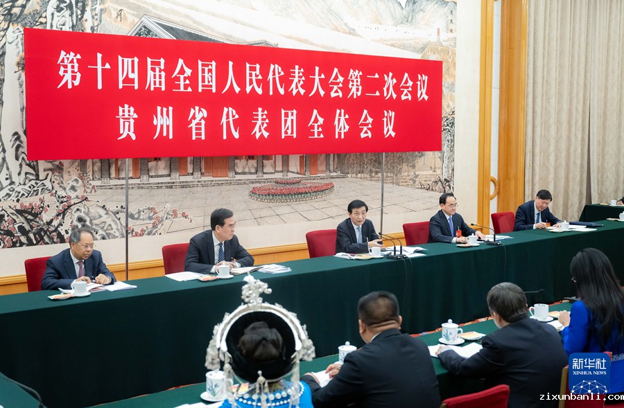 3月5日,中共中央政治局常委、全国政协主席王沪宁来到他所在的贵州代表团,同代表们一起审议政府工作报告。新华社记者 翟健岚 摄