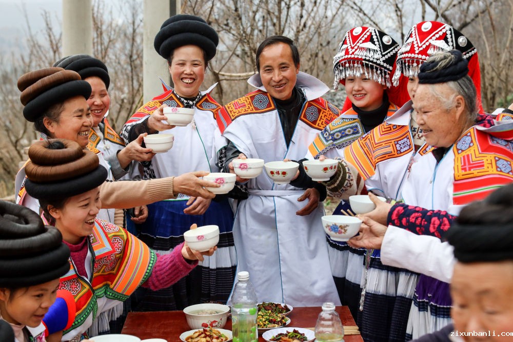 在位于乌蒙山区腹地的贵州省毕节市纳雍县,村民马雍(右五)与妻子黄国琴(左五)在年夜饭上与大家干杯(2021年2月11日摄)。新华社记者 欧东衢 摄