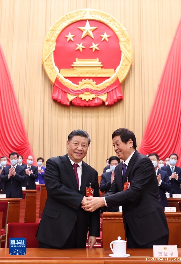 在掌声中,新当选的全国人大常委会委员长赵乐际起身,向代表们鞠躬致意。随后,他走向习近平,两人亲切握手,习近平向他表示祝贺。赵乐际又同十三届全国人大常委会委员长栗战书握手,相互致意。