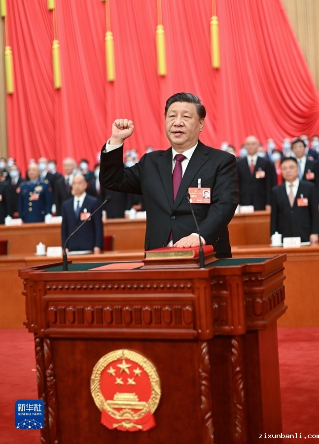 3月10日,十四届全国人大一次会议在北京人民大会堂举行第三次全体会议。习近平全票当选中华人民共和国主席、中华人民共和国中央军事委员会主席。这是习近平进行宪法宣誓。 新华社记者 鞠鹏 摄