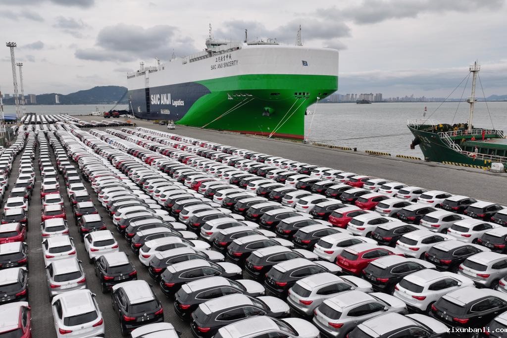 2024年1月23日,在福建厦门东渡港区现代码头,3700余辆汽车陆续驶上“上汽安吉申诚”号汽车滚装船(无人机照片)。新华社记者 姜克红 摄