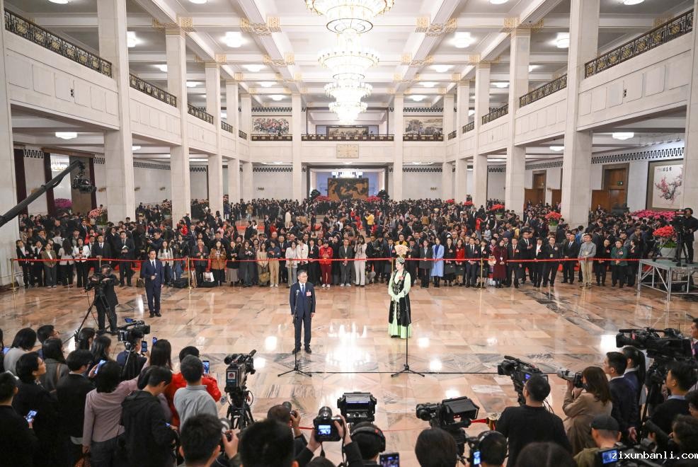 闭幕会前,人民大会堂中央大厅北侧,第三场“代表通道”集体采访活动正在进行。